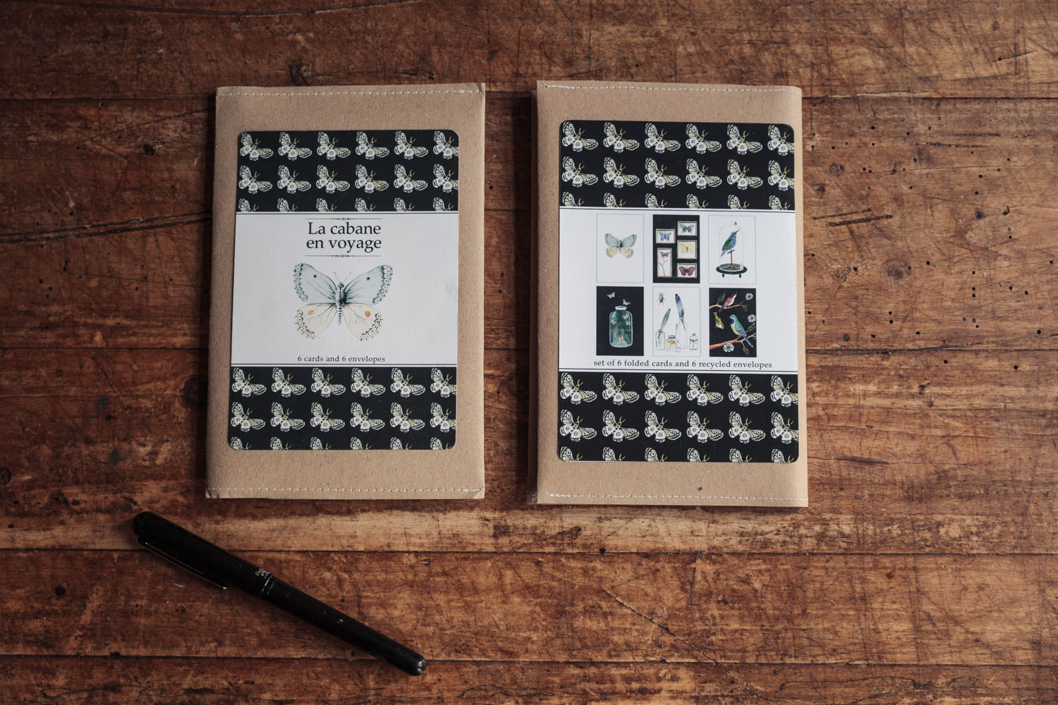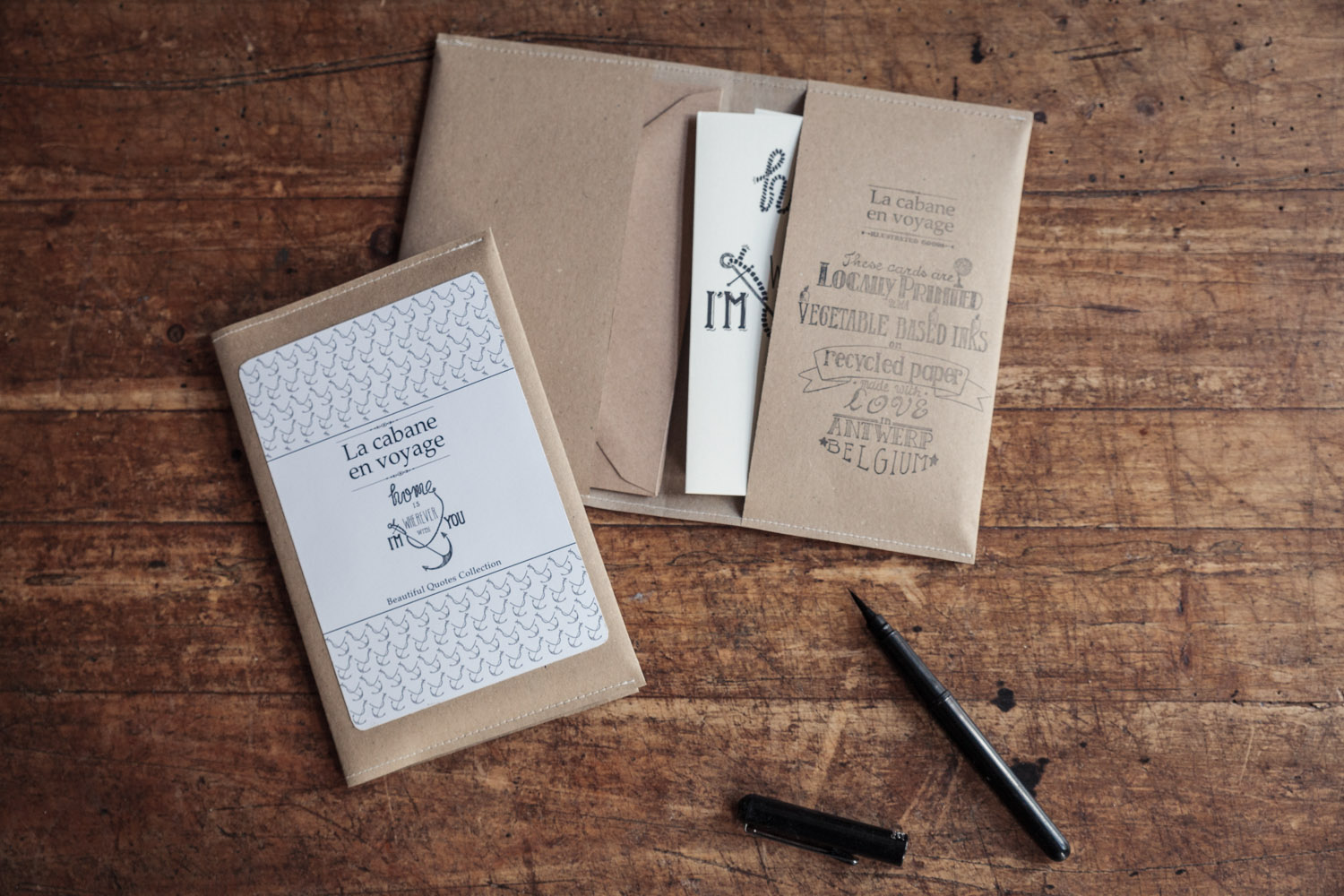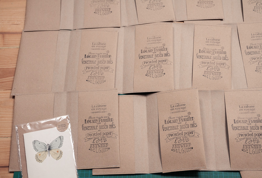 A set of six cards & matching enveloppes is packed in a handmade craft-paper sleeve, which is finished with a typograpic stamp on the inside.