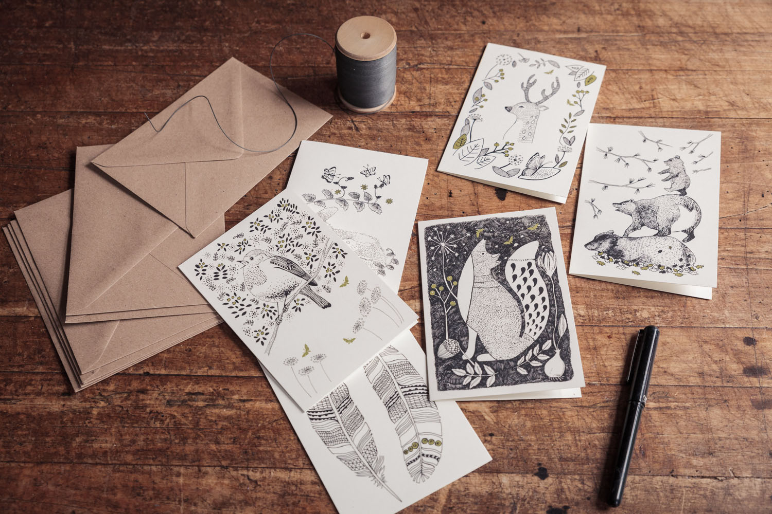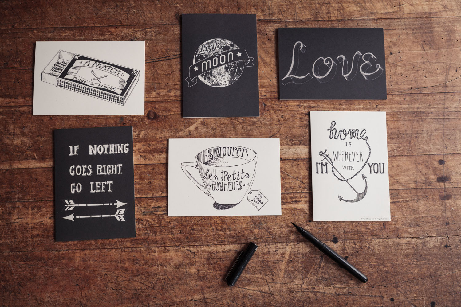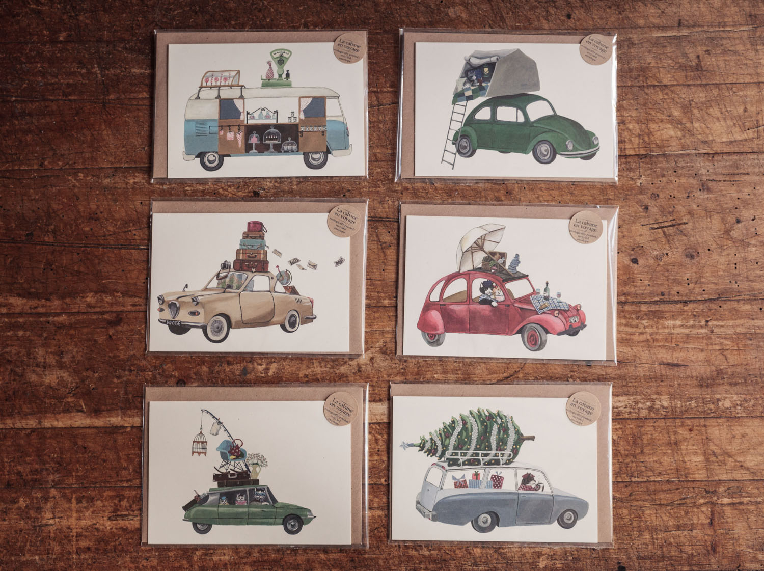 A set of six cards & matching enveloppes is packed in a handmade craft-paper sleeve, which is finished with a typograpic stamp on the inside.
