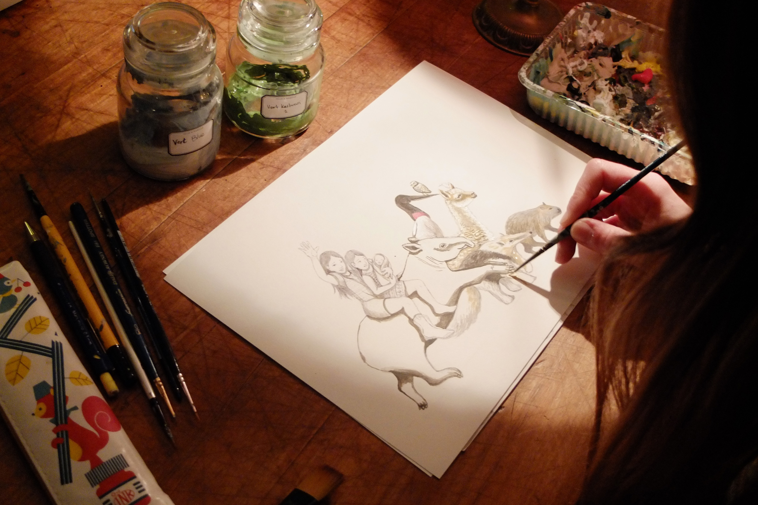 I've been working at several projects at once lately: a new series of cards with happy birthday cats, the last drawings for Shanti and a new birth announcement card.