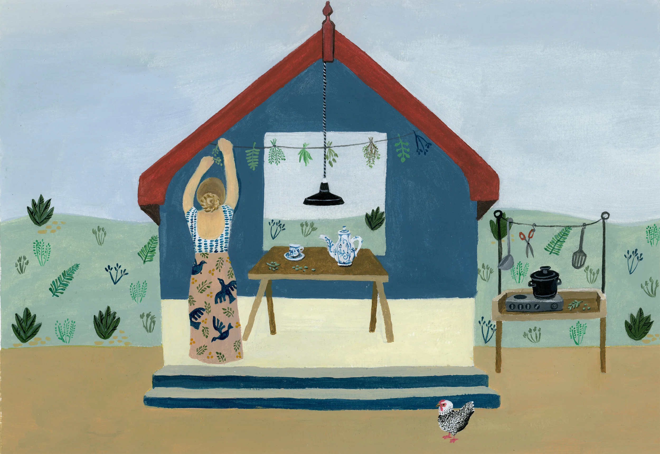 So this illustration is the first one in this series about my dream life. The pools and pirates are gone, but you will notice my love for tree houses/cabins and animals is still alive and kicking. This one is called 'The herb garden' and illustrates my desire for a simple life in nature.