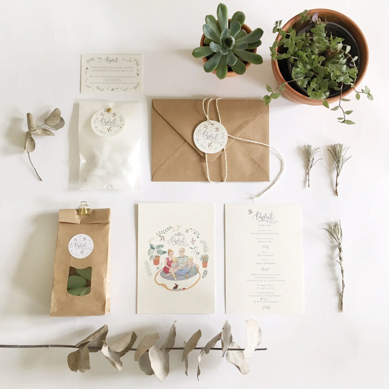 Het mocht een speels kaartje worden met veel planten, zwaluwen en de konijnen des huizes mochten er ook bij. Ik ontwierp ook een bijpassend geboortefeest kaartje, stickertjes en labeltjes.